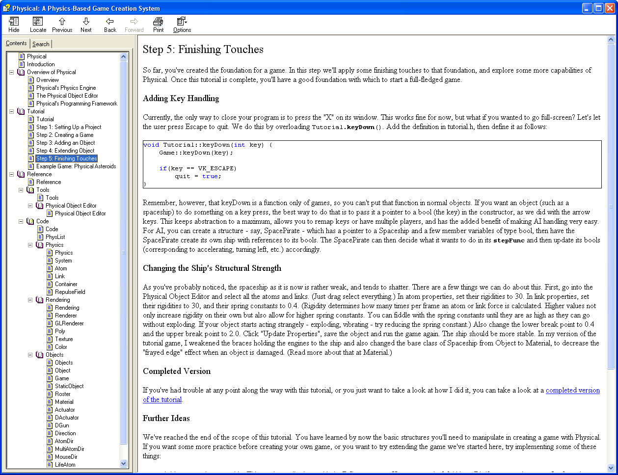 Physical is largely complete at this stage, and represents many months of intense work as well as years spent developing predecessor projects that built up to it. It has a large basis of pre-built classes to help get new users up to speed and a 50 page help file with a tutorial and reference manual of every class and function. Current development is focused on refining the core engine, adding new rendering features, and increasing physics engine speed. It is currently being used to develop a game by a student in the Game Design Initiative at Cornell (a research class in which I am also a student), and may be used as soon as next semester as one of the basic engines for students in the CIS 300 Introduction to Computer Game Design course at Cornell.