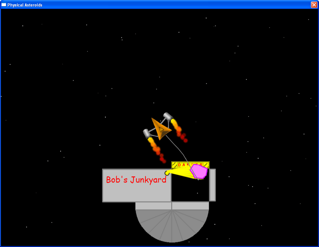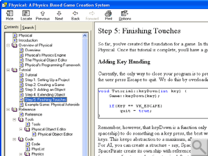 More prosaically, Physical is a game programming library that is built upon the foundations of a 2D physics engine. It handles the basics of window creation, graphics, and keyboard and mouse handling, and it automates game flow. It provides a framework that allows for a direct mapping from game design to game programming. By virtue of its basis in a universal physics engine, it features interchangeable and reusable parts, to the extent that interactive elements such as an airplane or a gun from one game can be placed in another game entirely - maintaining not just the model and image files but the actual dynamics that make the plane fly or the gun shoot. It also includes a physical object editor that makes it a cinch to create objects from image files and give them physical properties. Finally, it uses a physics engine of a totally unique kind that allows for objects and materials that collide, bend, flow and, most importantly for game developers, break realistically.